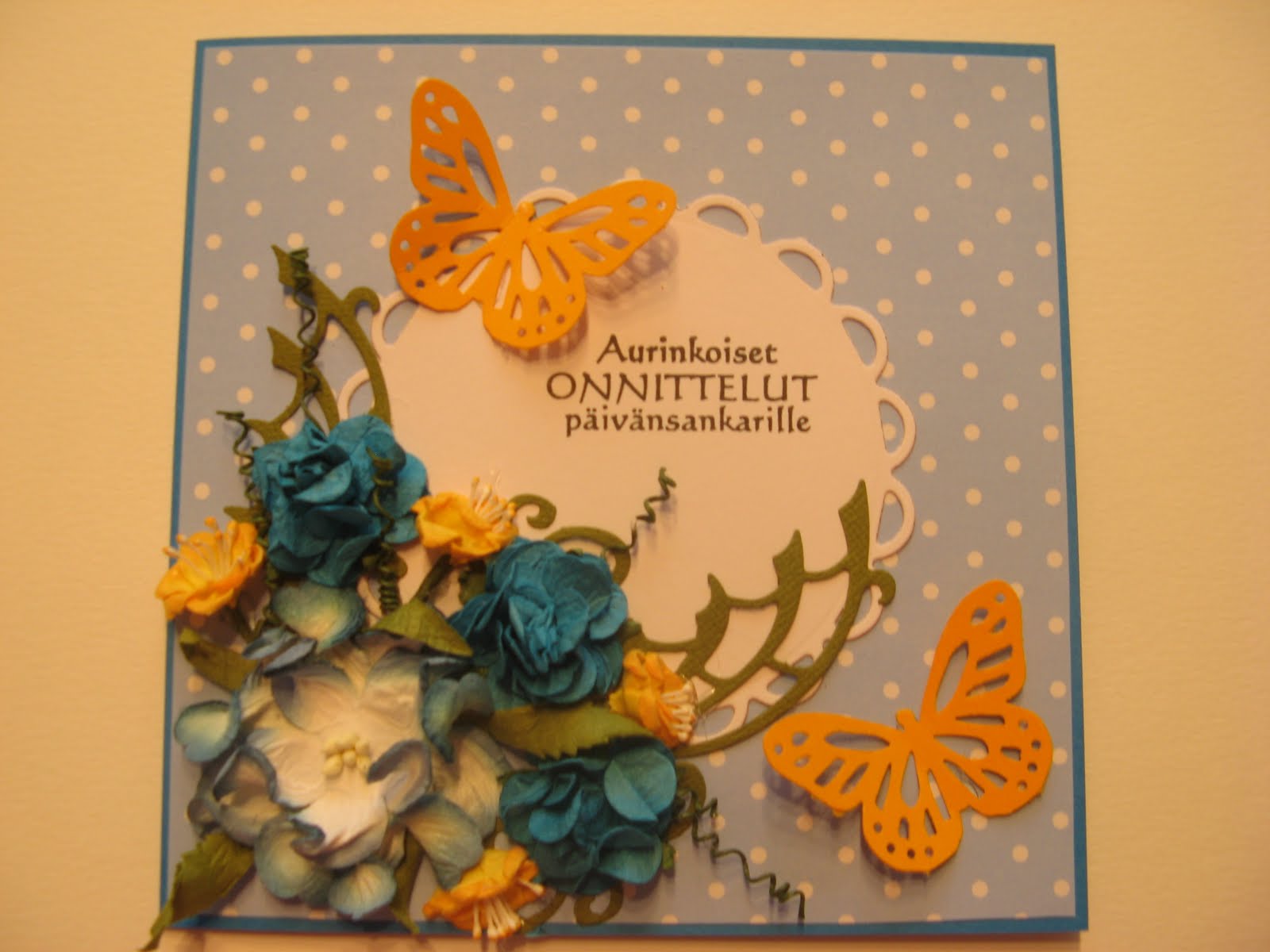 P*skarteluhaasteessa aiheena oli tällä kertaa kukat, joita piti olla mielellään runsaasti. Päätin osallistua tällä onnittelukortilla haasteeseen.